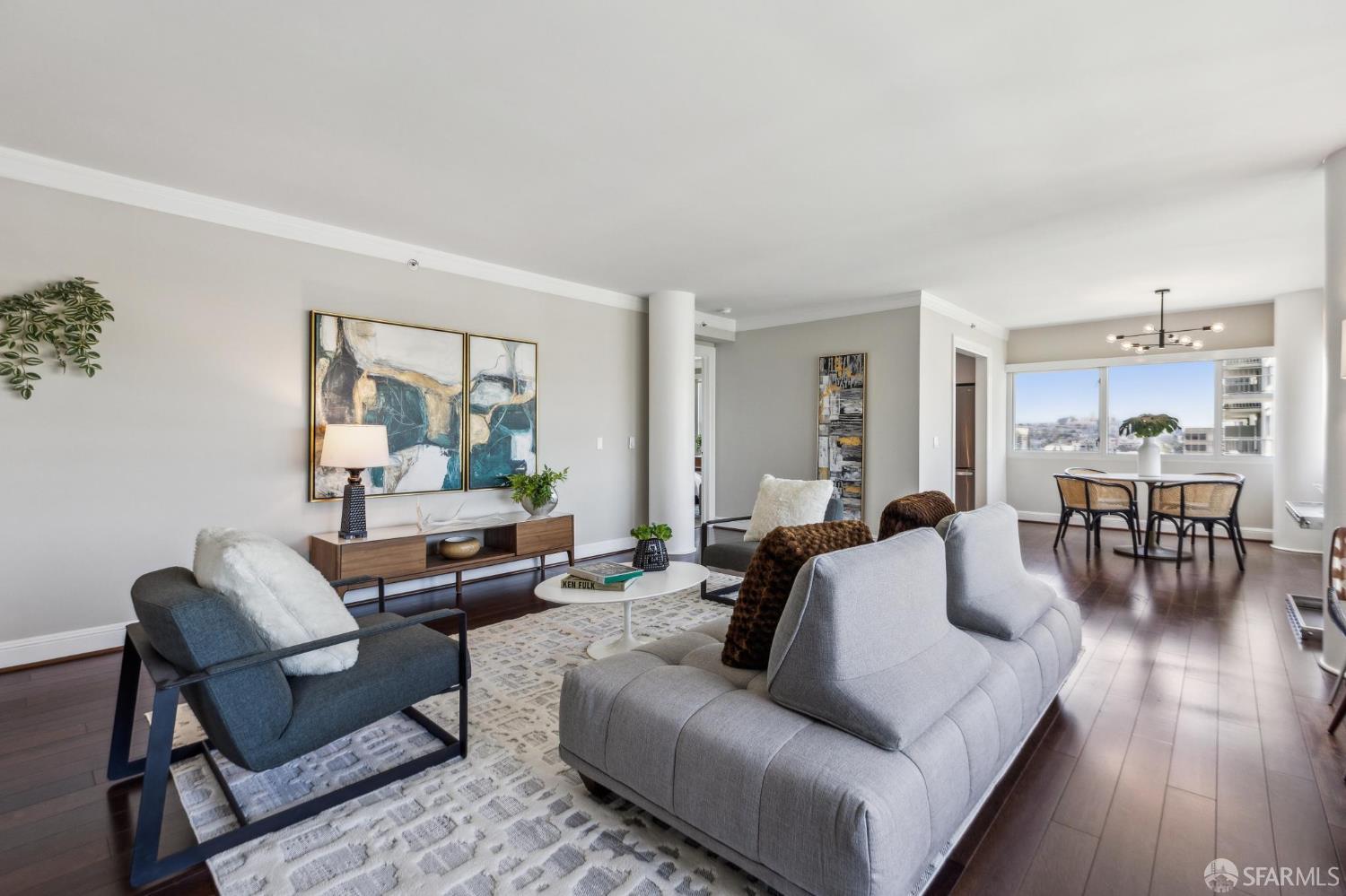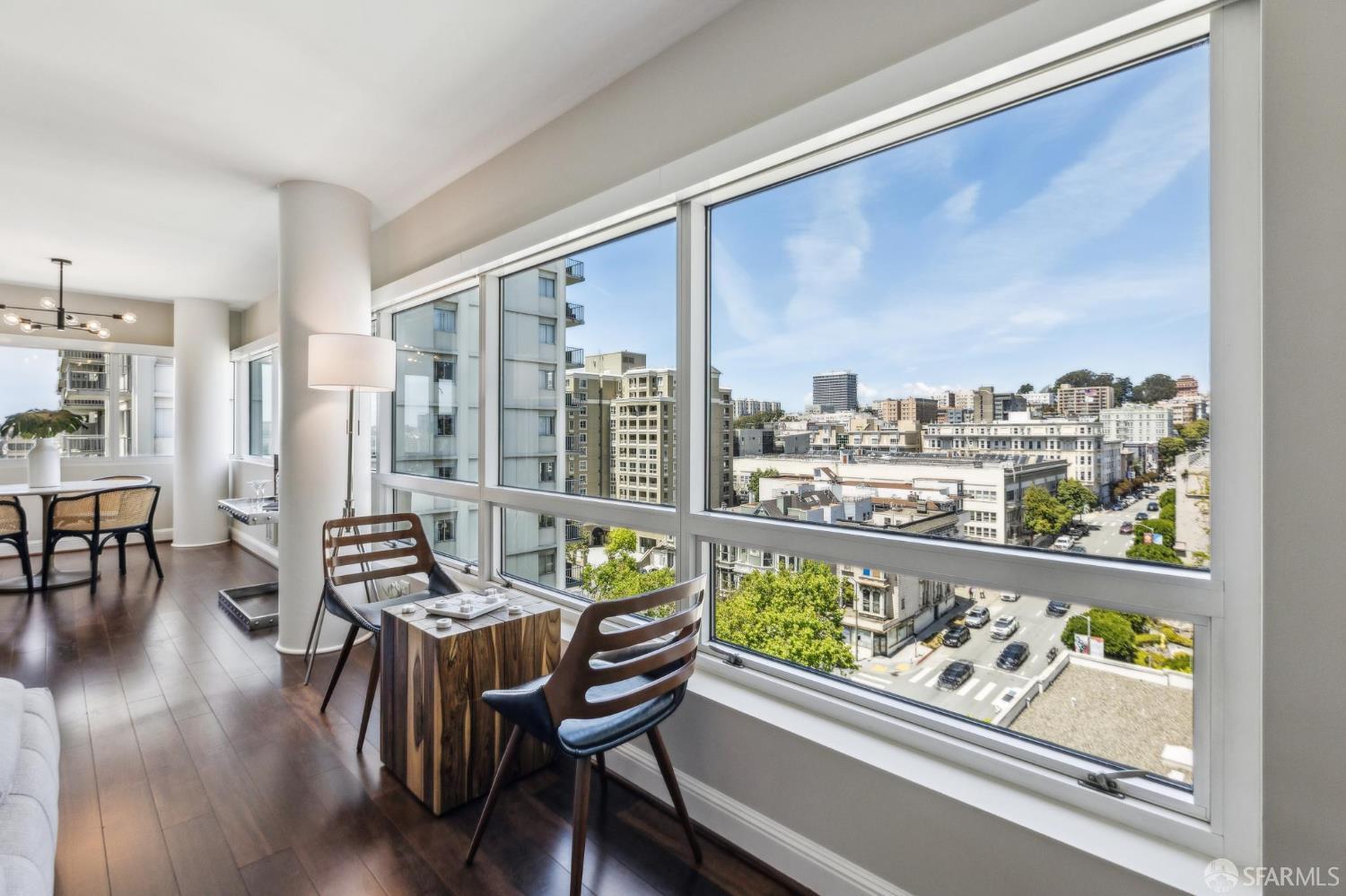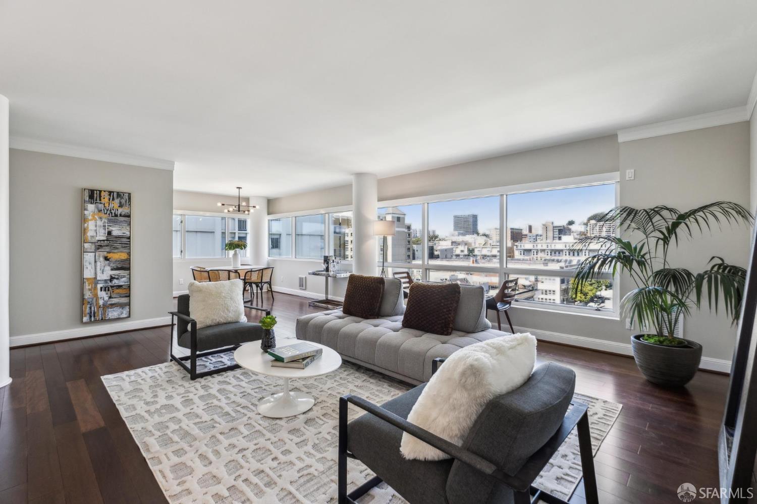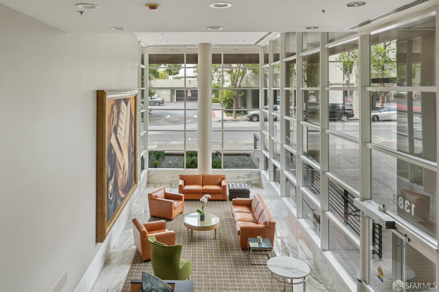 Seller to PAY 2 YEARS of HOA Dues nearly $50,000 back in Your Pocket! Experience elevated San Francisco living in this stunning high-floor corner condo, ideally located at the nexus of Downtown, Hayes Valley, Pac Heights, Fillmore, and Japantown. This expansive two-bedroom, two-bath home features a desirable split-wing layout, offering privacy for each bedroom suite. Oversized windows flood the space with natural light and frame sweeping city views day and night. The home's modern allure is accentuated by warm hardwood flooring, an updated kitchen with sleek finishes, and spa-inspired bathrooms designed for relaxation and indulgence. Entertain effortlessly in the open living and dining spaces, or retreat to your private sanctuary in one of the two spacious bedrooms. Additional comforts include in-unit laundry, one-car garage parking, and secure, additional storage. The amenity-rich building offers 24/7 concierge, security, protected package delivery, a full gym with locker rooms, guest parking, EV charging, and a peaceful rear garden oasis. 1388 Gough is prized for its solid construction and top-tier sound proofing offering both comfort and quiet. This is your chance to live where luxury, privacy, and convenience converge!